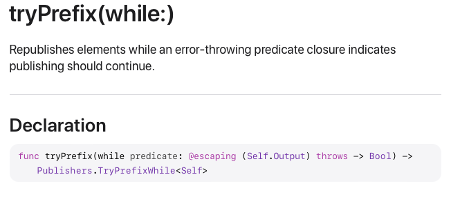 TryPrefixWhile Publisher를 활용해서 만든 Operator는 tryPrefix(while:)입니다.