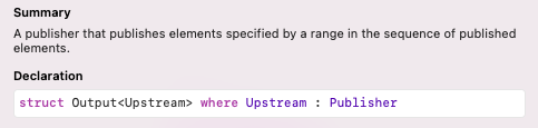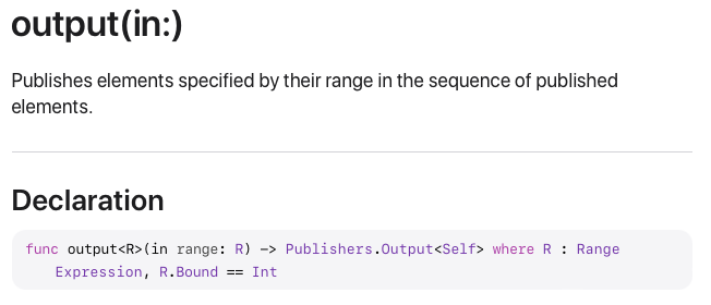 아까 output(at:)은 특정 순서의 값 하나만 Downstream으로 전달했다면 output(in:)은 특정 순서 범위의 모든 값을 Downstream으로 전달합니다.