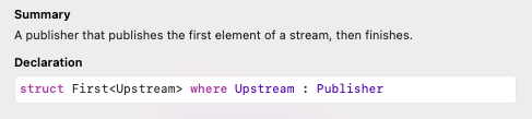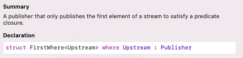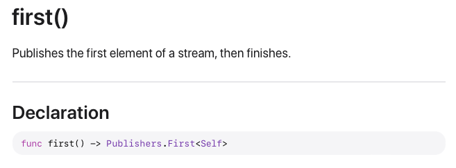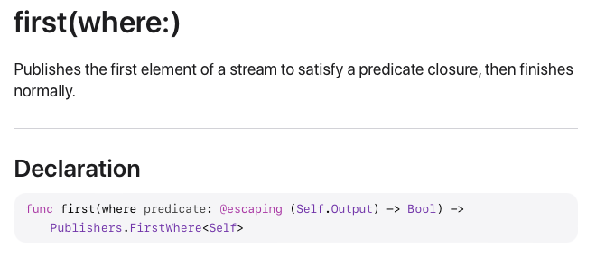 정의를 보면 주어진 클로저를 만족하는 첫 번째 값만 내려보내는 Publisher라고 합니다.