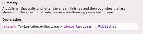 last(where:)과 동일하게 클로저를 만족하는 값 중 마지막 값을 Downstream으로 전달하며 에러도 던질 수 있습니다.