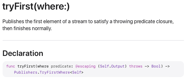 TryFirstWhere를 활용해서 만든 Operator는 tryFirst(where:)입니다.