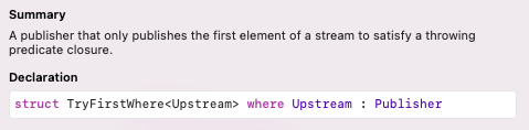 뭐 얘도 예상대로 first(where:)과 동일하게 주어진 클로저를 만족하는 첫 번째 값만 내려보내고 finish 되는데, 에러를 던질 수도 있는 녀석입니다.