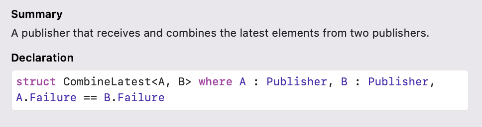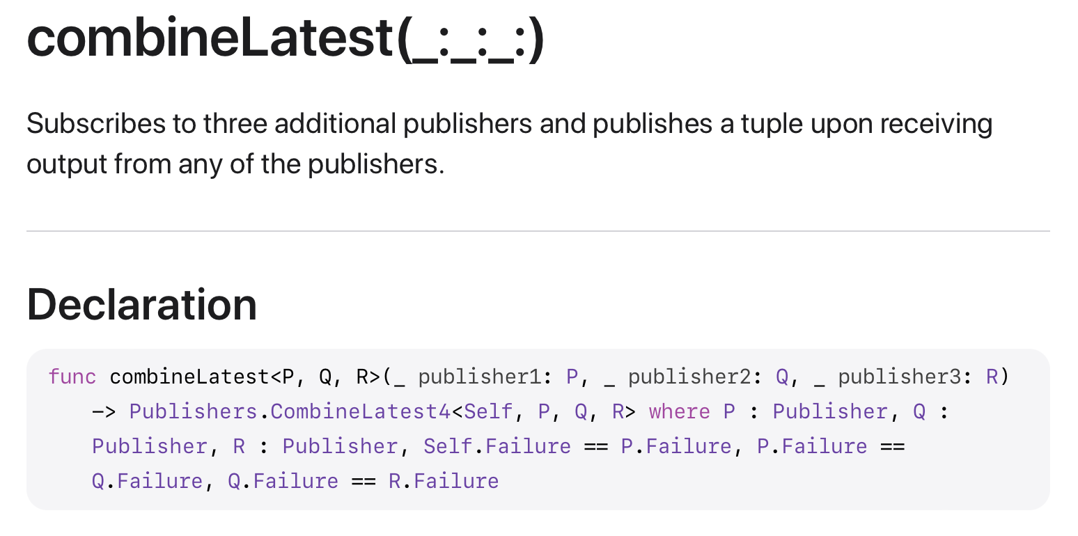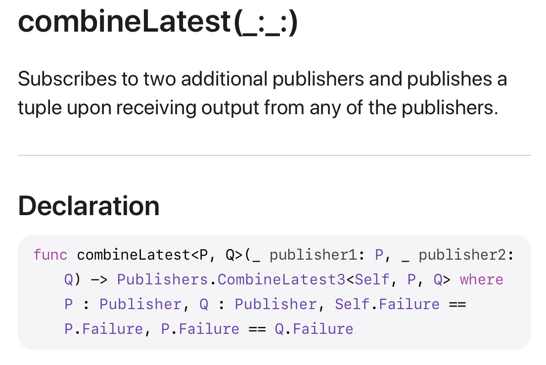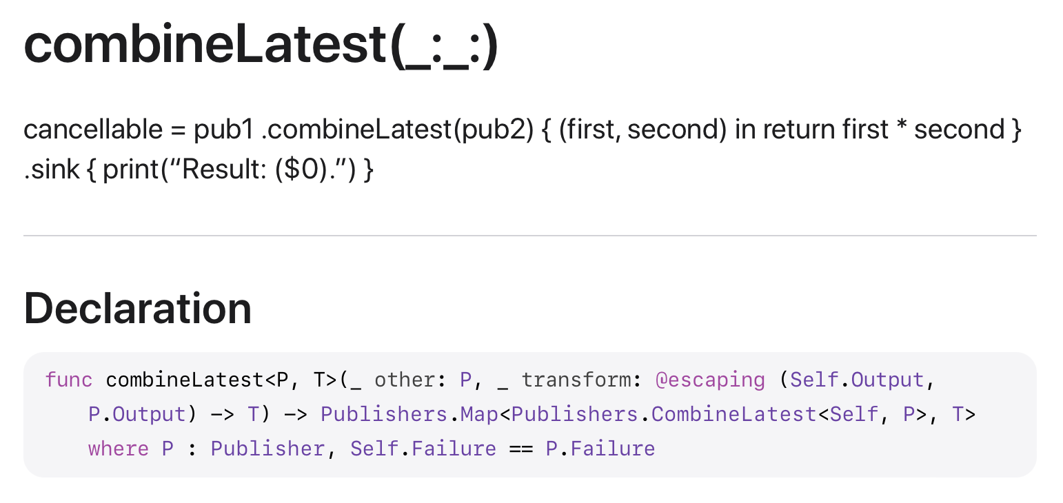 CombineLatest를 활용해서 만든 첫 번째 Operator는 combineLatest(_ other:, _ transform:)입니다. 공식문서에 정의가 이상하게 코드로 되어있네요 ㅋㅋㅋ.
