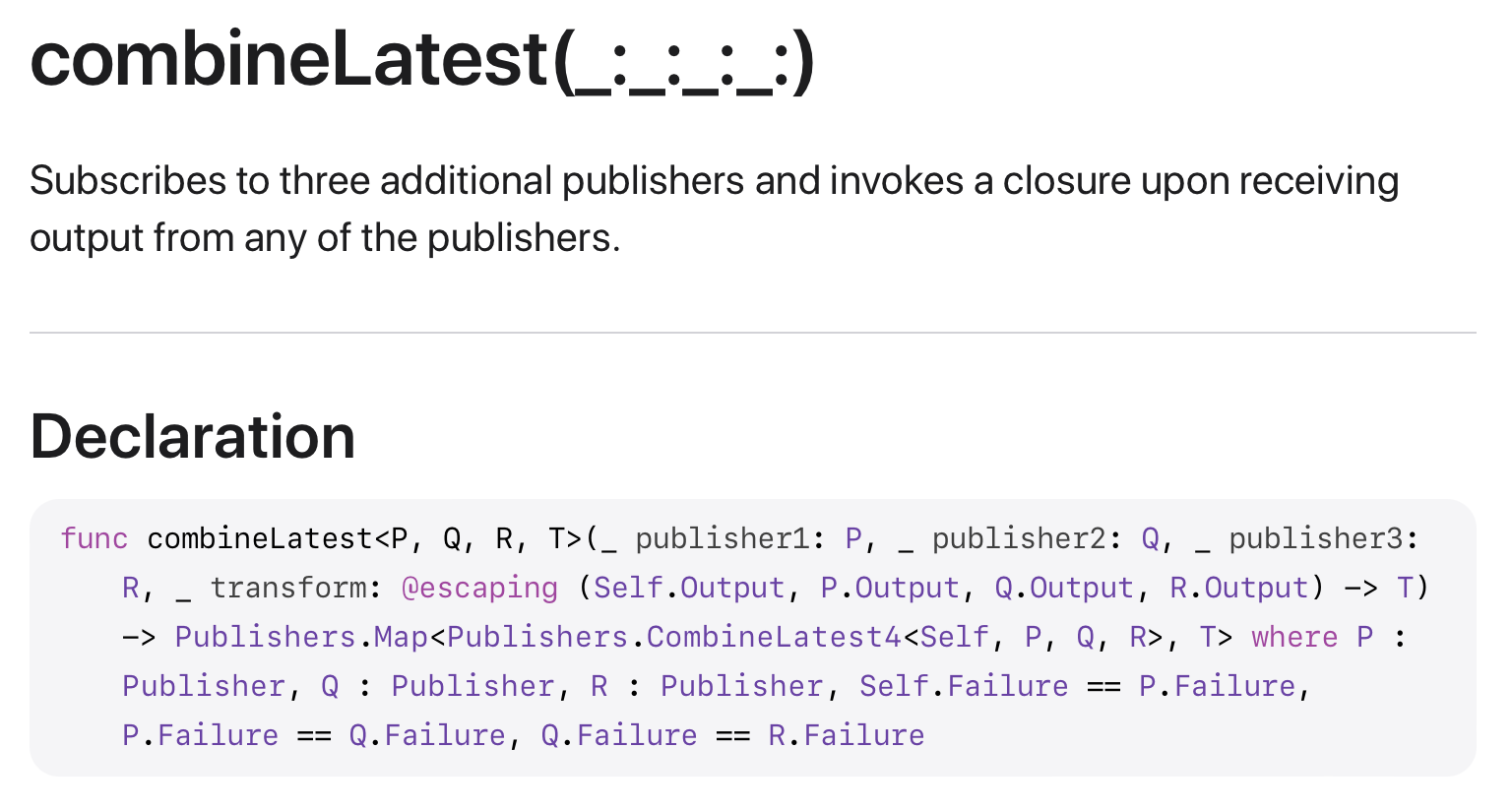 Publisher도 그렇고 Operator도 그렇고 모두 이름이 combineLatest네요. 그래서 헷갈리긴 한데.. 가만히 보면 규칙이 있습니다. 일단 Publisher의 경우 combineLatest, combineLatest3, combineLatest4와 같이 숫자가 증가하는데, 아까 분류된 이름에 Multiple Publisher가 있었는데 여기서 숫자가 아마 몇 개의 Publisher를 처리할 수 있는지를 나타내는 거 같네요.