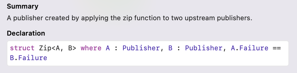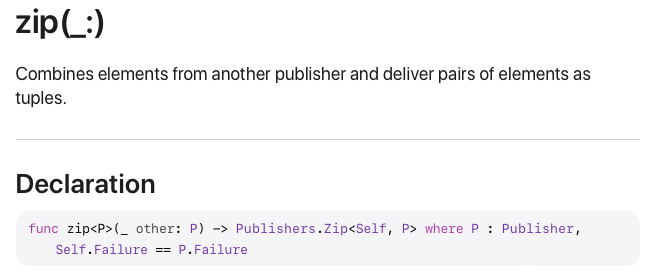 Zip Publisher를 활용해서 만든 첫 번째 Operator는 zip(_ other:)입니다. 정의를 보면 2개의 Publisher의 값을 튜플로 만들어서 Downstream으로 전달한다고 합니다.