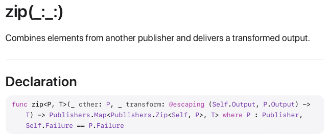 Opertaor도 보면 매개변수로 Publisher만 있는 것, transform이라는 클로저도 필요한 것으로 크게 두 개로 나뉩니다. 각각은 처리하는 Publisher의 개수만 달라지는 것이므로 이번 글에서는 2개의 Publisher를 처리하는 Zip Publisher와 이를 활용해서 만든 Operator에 대해서만 알아보도록 하겠습니다.