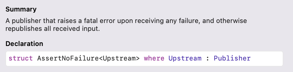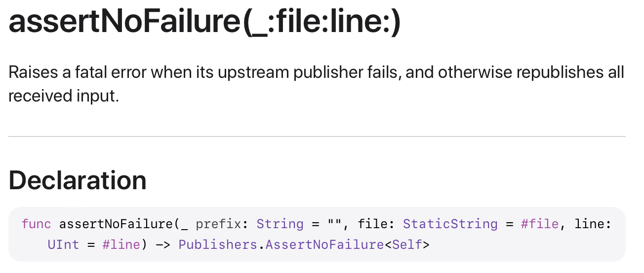 가장 먼저 알아볼 Publisher는 AssertNoFailure 입니다. 정의를 보면 failure event를 받으면 fatal error를 downstream에 전달하는 Publisher라고 되어있네요. 그 외의 경우엔 모두 Downstream으로 전달한다고 합니다.