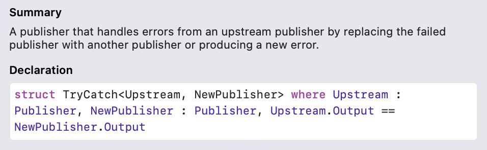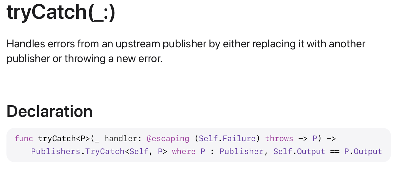 TryCatch Publisher를 활용해서 만든 Operator는 tryCatch(_:)이고 catch(_:)와는 에러를 던질 수 있다는 차이점만 존재하니 바로 사용해보고 넘어가겠습니다.