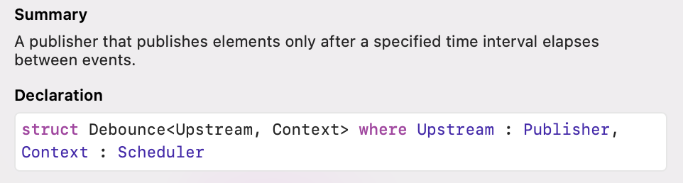 Debounce Publisher를 활용해서 만들어진 Operator는 debounce(for:scheduler:options:)입니다.