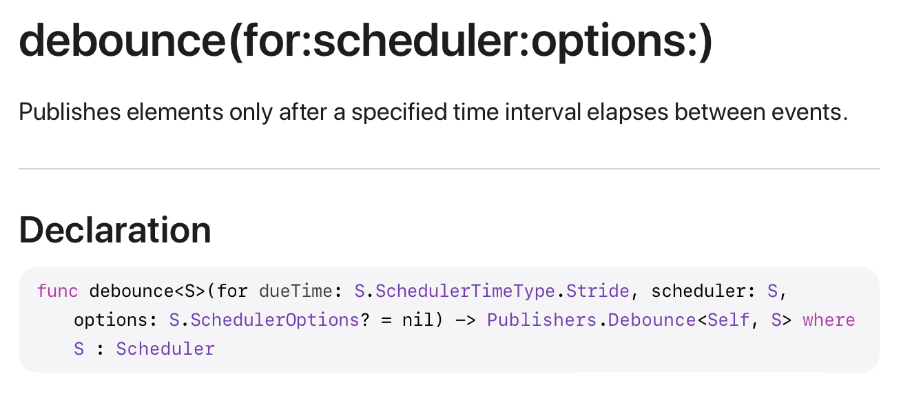 .debounce(for: .seconds(1.0), scheduler: DispatchQueue.main)