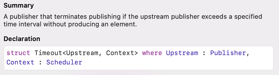 Timeout Publisher를 활용해서 만든 Operator는 timeout(_:scheduler:options:customError:)입니다.