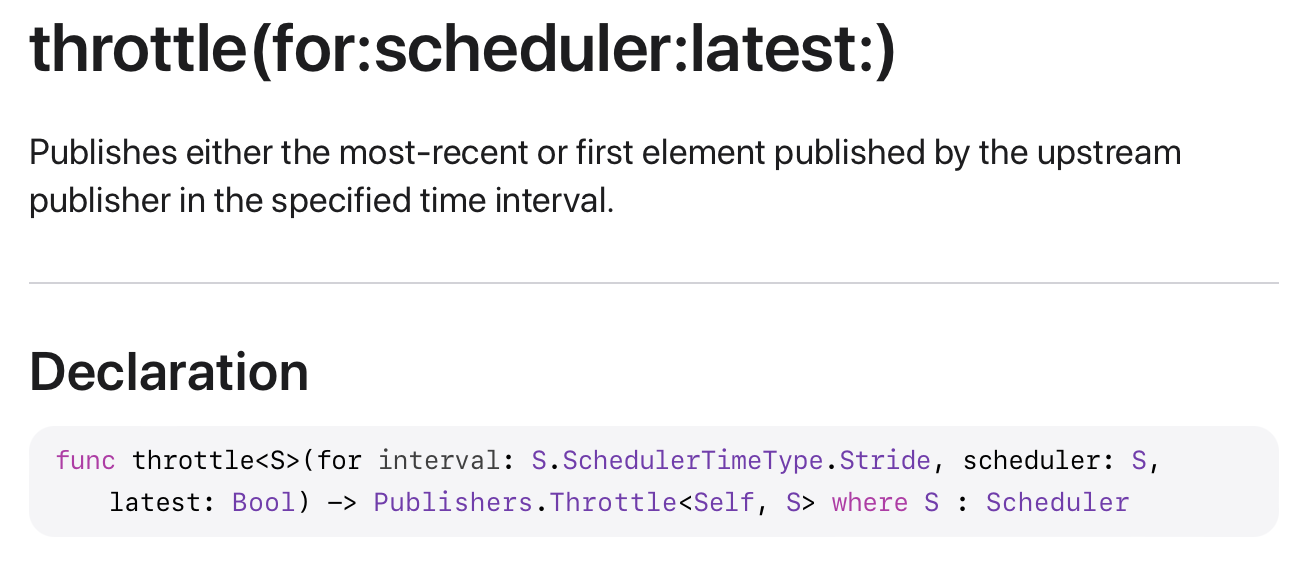 정리하자면, throttle을 사용하면 일정 시간 동안 Upstream Publisher에게 받은 값 중 최신 값 또는 첫 번째 값을 Downstream에 전달할 수 있다! 입니다.