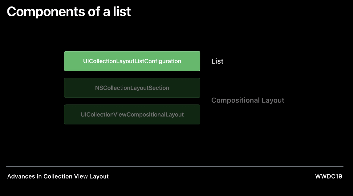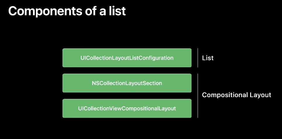 - iOS14에 새로 추가된 타입으로 컬렉션뷰에서 list를 만들 때 레이아웃을 담당하는 녀석이라고 보면 됩니다.