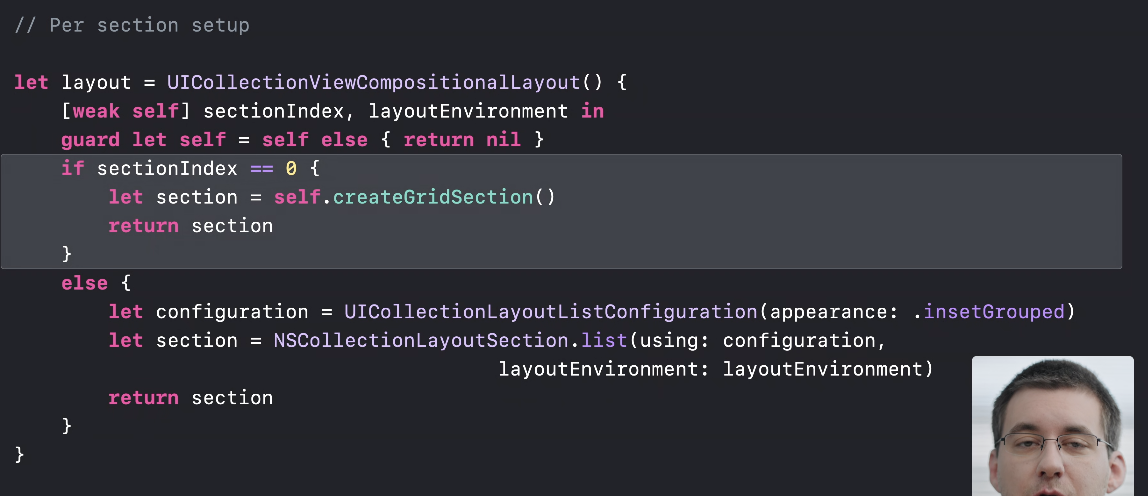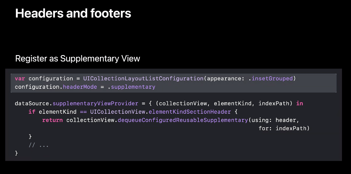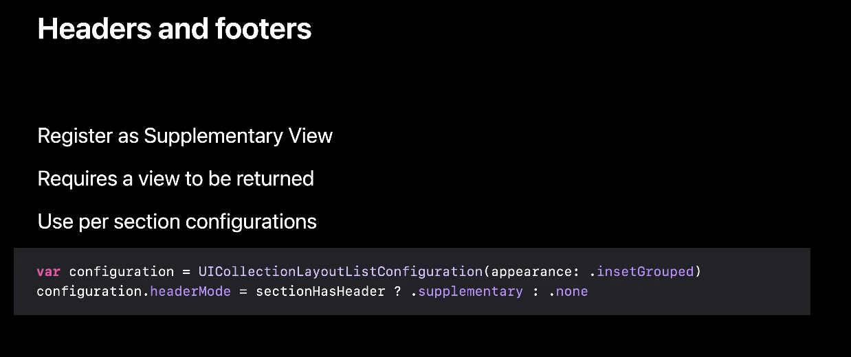 per-section setup을 사용할 땐 UICollectionLayoutListConfiguration은 그대로 사용하지만 위 코드와 같이 UICollectionViewCompositionalLayout 대신 NSCollectionLayoutSection을 사용한다고 합니다.