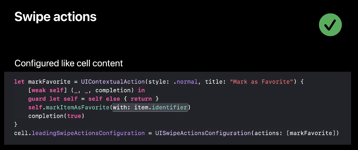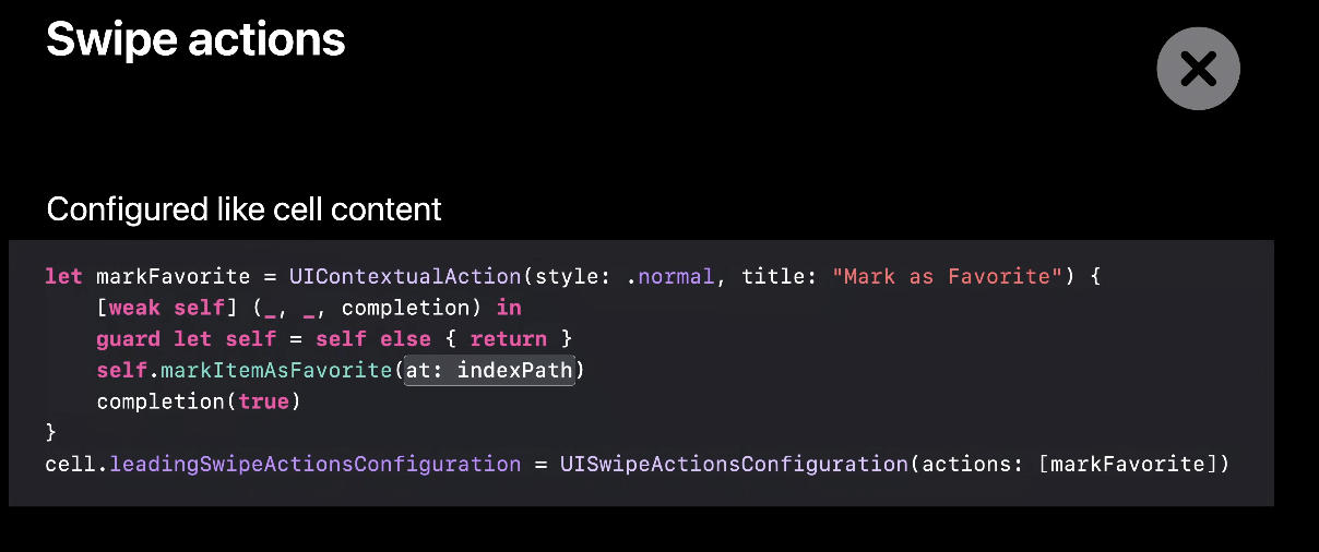애플은 위와 같이 스와이프 액션에 indexPath를 캡처하지 말라고 하는데요, 셀을 삽입, 삭제 등의 동작이 있는 경우 해당 값이 상수가 아니기 때문이라고 합니다.