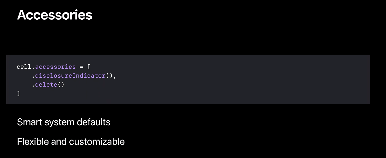 그래서 ListCell에서는 이걸 개선해서 Leading, Trailing 모두 accessory가 있을 수 있고 심지어 각 부분마다 여러 개의 accessory도 있을 수 있다고 합니다.