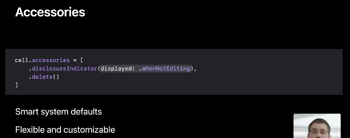 아주 재밌는 점은 disclosureIndicator는 leading accessory이고 delete는 trailing accessory라는 걸 시스템이 알고 있어서 자동으로 배치해 준다고 해요.