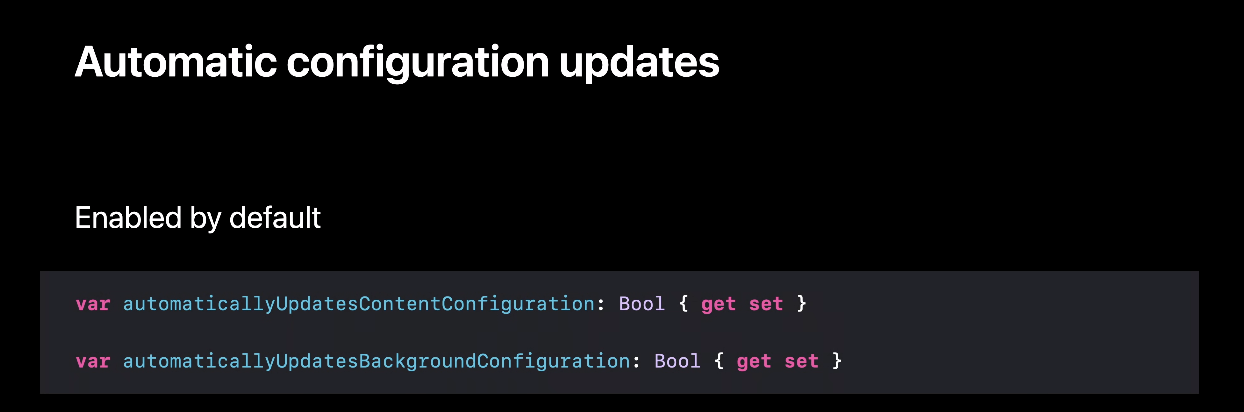 위 프로퍼티들은 기본적으로 true라서 background, content configuration은 configuration state가 바뀔 때마다 configuration을 해당 상태에 맞게 업데이트한다고 합니다. 물론 false로 바꾸면 업데이트되지 않겠죠?