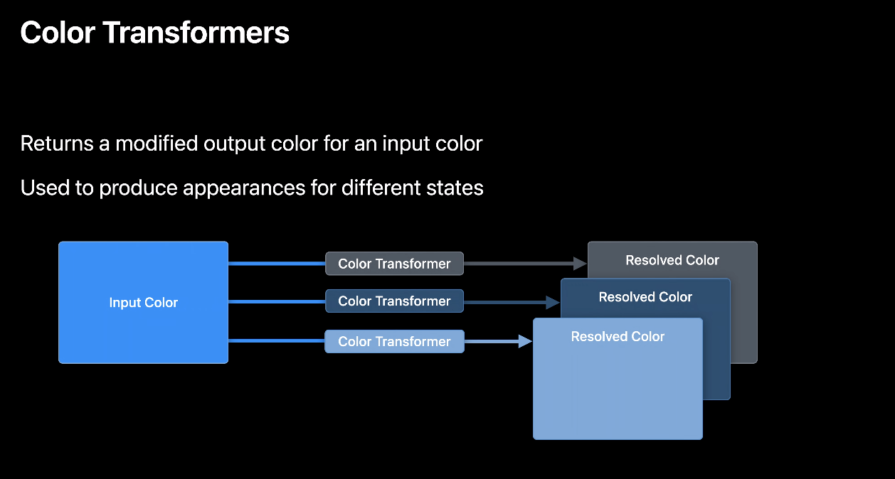 예를 들어 색의 회색조 버전을 반환하는 color transformer가 있을 수 있는 거죠. Color Transformer는 단순한 기능인데, 애플이 늘 새로운 기능에 대해 하는 말대로 강력하다고 합니다. 얘가 강력한 이유는 다른 color transformer를 사용해서 동일한 input color에 대해 다양한 색을 생성할 수 있기 때문이라고 합니다. (위 그림처럼요!)