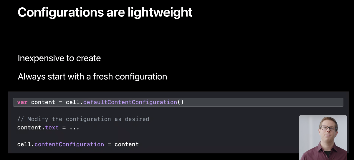 위 코드와 같이 셀을 구성할 땐 defaultContentConfiguration()로 새로운 configuration을 매번 만들어야 하는데, 비용이 저렴하니 매번 만드는 코드에 대한 걱정을 하지 말라고 합니다.