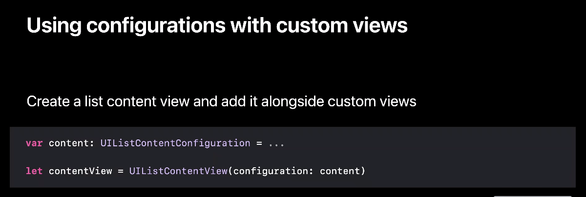 configuration을 사용해서 list content view를 생성하고 업데이트 한 뒤 직접 만든 뷰의 subview로 추가할 수 있다고 하네요. 이렇게 하면 content configuration의 모든 기능을 활용가능하고, 직접 만든 뷰와 결합하여 사용 가능하다고 합니다.