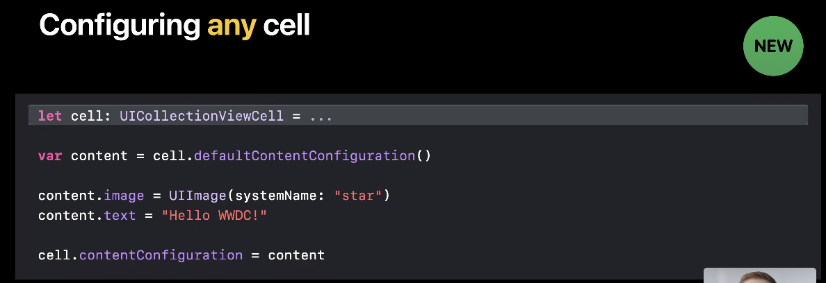 아까도 언급됐지만 configuration을 사용할 때는 이전 상태를 걱정할 필요 없이 항상 새로운 configuration을 만들어서 설정한 뒤 셀에 적용하면 됩니다. 그리고 configuration을 설정하고 적용하는 코드를 한 곳에 두는 것이 좋다고 합니다. 보통은 그 위치가 updateConfiguration(using state:) 메서드라고 하네요!