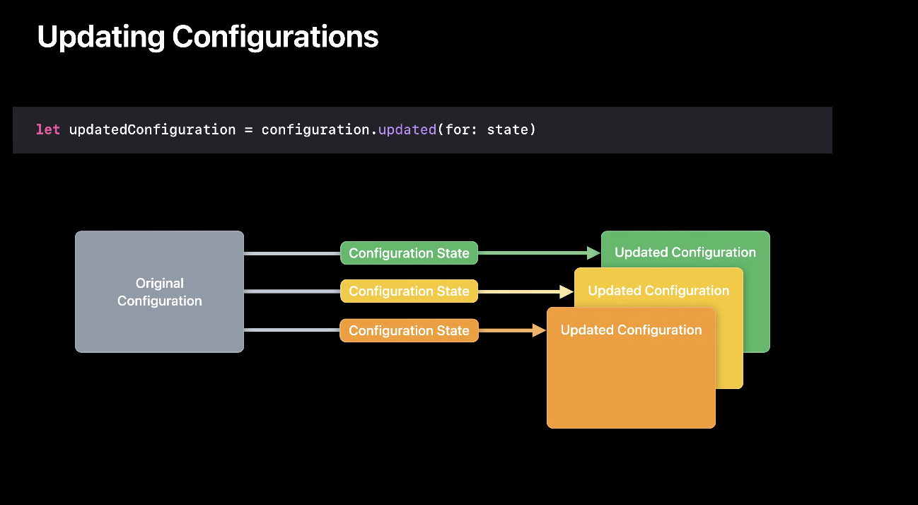 그래서 이러한 configuration state로 할 수 있는 게 무엇이냐 하면, 위와 같이 상태에 대해서 configuration을 업데이트하는 것입니다. 즉 configuration에 대해 state를 넣어주면, 해당 state의 configuration이 반환되어 그걸 사용하면 되는 거죠. 당연히 값 타입이니 기존 것과 새로 만들어진 것은 독립적이므로 서로 영향을 주지 않습니다.