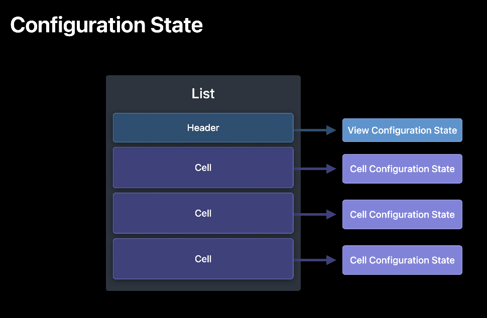 그런 configuration state는 어디에 있는가 하면, 위와 같이 셀과 header, footer에는 자신만의 configuration state가 있습니다. 그럼 view configuration은 어떻게 생겼을지 볼게요.