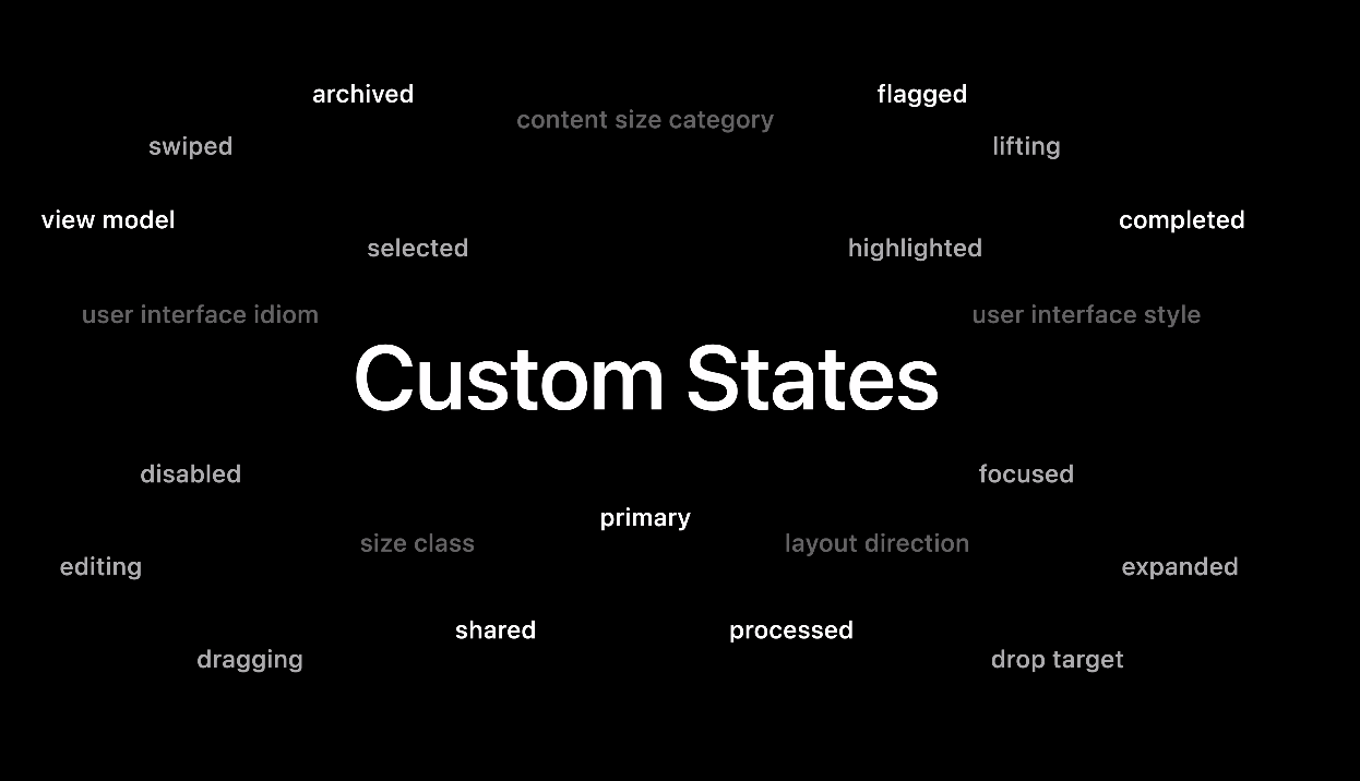 위와 같이 Trait Collection을 시작으로 highlighted, selected, disabled, focused라는 네 가지 상태가 있고, 있을 수도 있고 없을 수도 있지만 직접 만든 custom State도 있습니다. 간단하죠?
