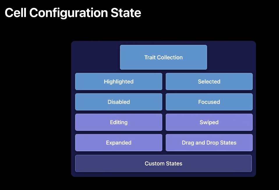 다음으로 cell configuration state를 보면 위와 같습니다. view configuration state가 가지고 있던 모든 것을 가지고 있고, 추가로 editing, swiped, expanded, drag and drop이라는 상태들도 가지고 있네요.