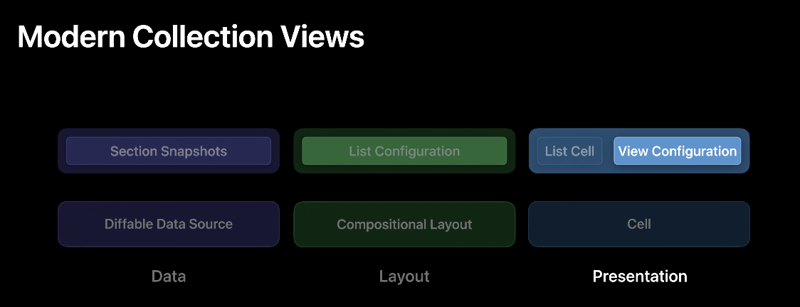 이게 가능한 이유는 configuration을 compasable(구성)할 수 있기 때문이라고 하는데, 좀 더 풀어쓰면 기존 방식과 같이 셀 클래스에서 모양을 구성하는 대신, configuration을 만들고 이걸 지원하는 셀이나 뷰에 필요한 것들을 연결하여 사용하다 보니 가능하다고 하네요.