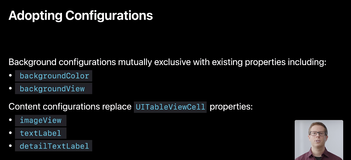 그리고 테이블뷰 셀에 한해서, content configuration을 사용하면 imageView, textLabel, detailTextLabel과 같은 기본으로 제공하는 뷰들을 대체한다고 합니다. 또한 이후 버전에서는 더 이상 사용되지 않을 거니 주의하라고 하네요.