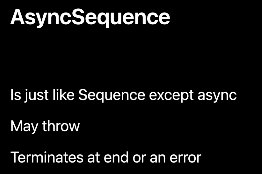 여기서 AsyncSequence와의 차이점은 AsyncSequence는 각각의 Element에서 suspend 되고 iterator가 값을 생성하거나 에러를 던질 때 다시 resume 된다는 것입니다.