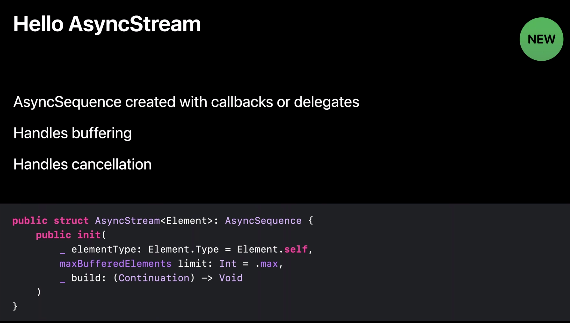 위와 같이 safety, iteration, cancellation와 같이 Async Sequence에서 기대하는 모든 것을 처리할 수 있고 buffering도 처리할 수 있기 때문에 AsyncStream은 기존 코드를 Async Sequence로 만들 때 사용하기 좋습니다.