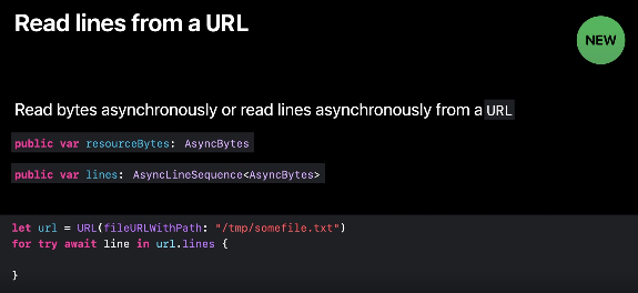 새로운 bytes 프로퍼티를 위와 같이 비동기 바이트 시퀀스를 라인단위로 변환하는 새로운 api인 lines와 함께 사용하면 라인단위로 파일을 처리할 수 있다고 하네요.