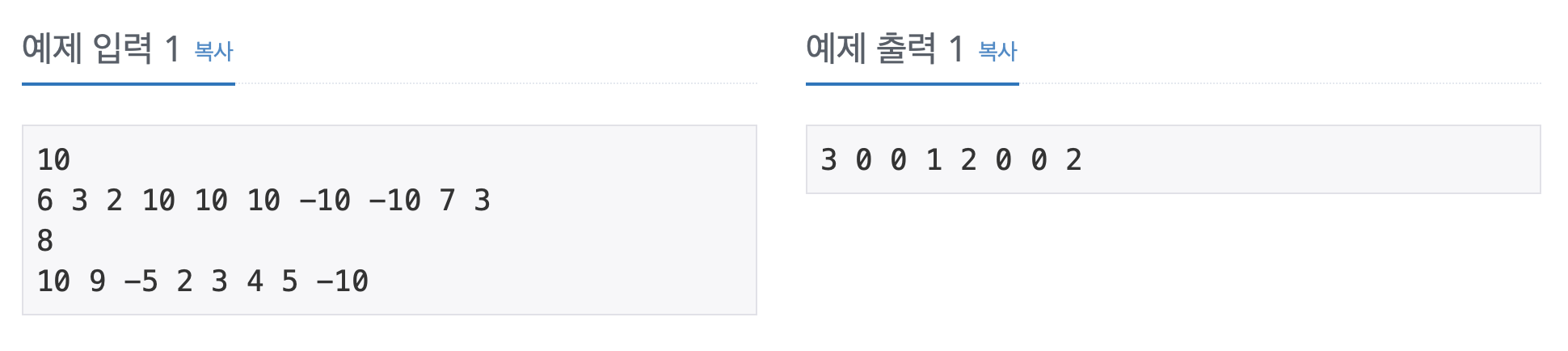 첫째 줄에 상근이가 가지고 있는 숫자 카드의 개수 N(1 ≤ N ≤ 500,000)이 주어진다. 둘째 줄에는 숫자 카드에 적혀있는 정수가 주어진다. 숫자 카드에 적혀있는 수는 -10,000,000보다 크거나 같고, 10,