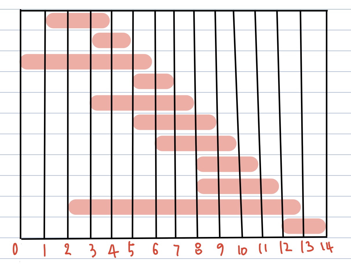 위의 그림처럼 예약이 되어있을 때 어떻게 겹치지 않게 최대한 많이 회의를 진행할 수 있을까...?