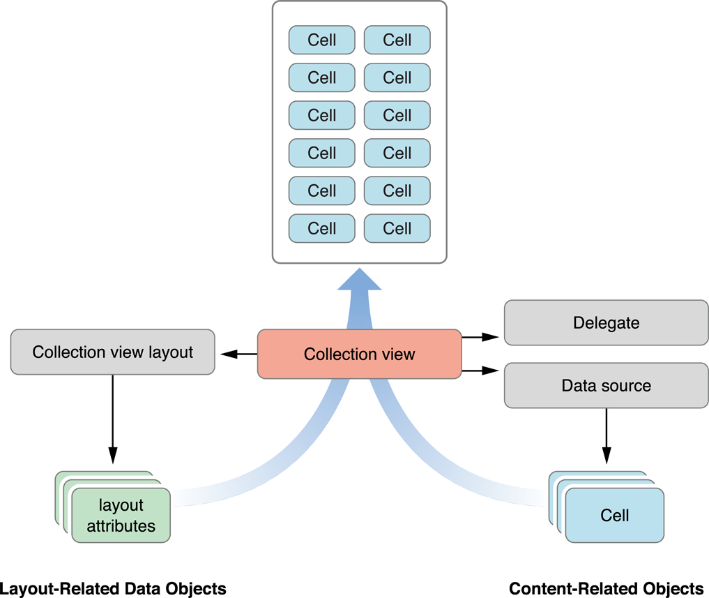위의 그림은 컬렉션 뷰와 관련된 핵심 객체들과의 관계를 보여준다. 컬렉션 뷰는 데이터 소스에서 보여줄 셀에 대한 정보를 가지고온다. 데이터 소스 및 델리게이트 객체는 앱에서 제공하는 사용자 정의 객체이며 셀이 선택되고 강조되는 등의 기능들을 관리하는 데 사용된다. 레이아웃 객체는 해당 셀이 속하는 위치를 결정하고 하나 이상의 레이아웃 속성 객체로 컬렉션 뷰에 전송한다. 그런 뒤 컬렉션 뷰는 레이아웃 정보를 실제 셀이나 다른 뷰들과 결합하여 최종족으로 보이게 되는 화면을 만든다.