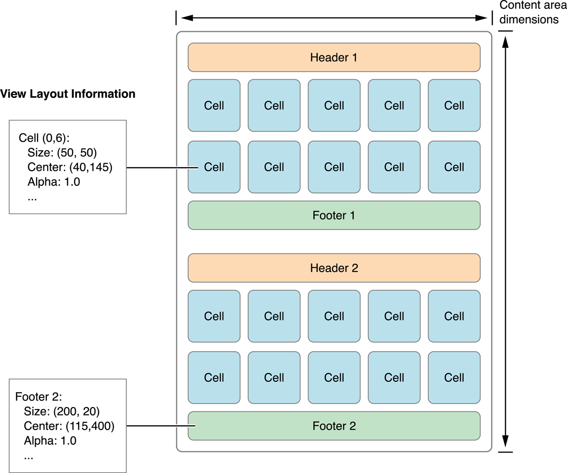 위의 그림은 수직 스크롤 flow 레이아웃이 셀과 보조 뷰를 정렬하는 방법이다. 수직 스크롤 flow 레이아웃에서 내용 영역의 너비는 고정된 상태로 유지되며 내용에 맞게 높이가 증가한다. 배치 객체는 뷰와 셀을 한 번에 하나씩 배치하고 각자 가장 적합한 위치를 선택한다. Flow 레이아웃의 경우 셀과 보조 뷰의 크기는 레이아웃 객체 또는 델리게이트를 사용하여 속성으로 지정된다. 레이아웃 계산은 이러한 속성을 사용하여 각 뷰를 배치하기만 하면 된다.