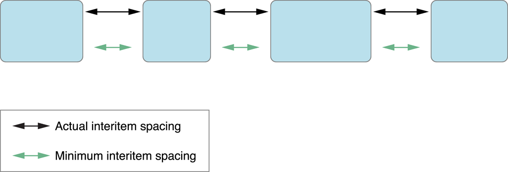 다른 flow 레이아웃 속성들과 마찬가지로 고정된 간격을 설정하거나 동적으로 값을 바꿀 수 있다. 행과 항목들의 간격은 섹션별로 처리되는데 그렇기 때문에 행과 항목 간 간격은 주어진 섹션의 모든 항목에는 동일하지만 다른 섹션의 항목들과는 다를 수 있다. Flow 레이아웃 객체의 minimumLineSpacing, minimumInteritemSpacing 프로퍼티나 컬렉션 뷰 델리게이트의 collectionView(_ :layout, _ :minimumLineSpacingForSectionAtIndex), collectionView(_ :layout,_ :minimumInteritemSpacingForSectionAtIndex) 메서드로 간격을 설정할 수 있다.