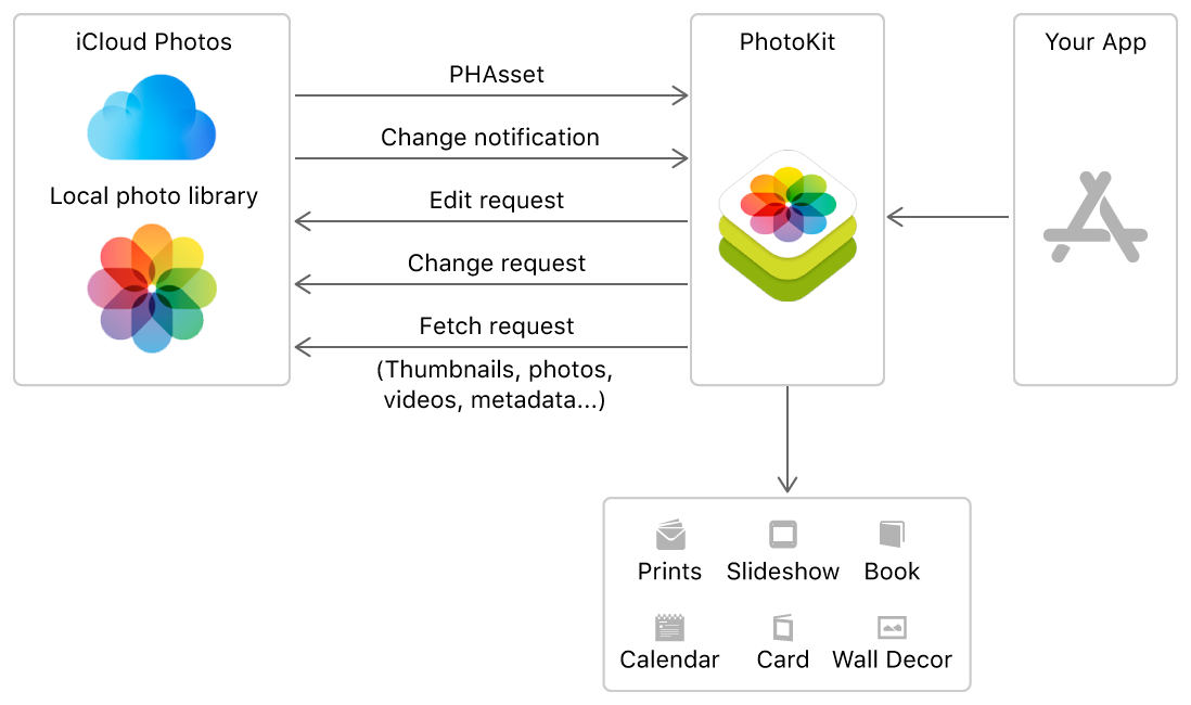 위의 그림과 같이 PhotoKit을 사용하면 보여주거나 재생을 위해 비디오나 이미지를 가져오고 이들을 편집하거나 앨범, 공유 앨범과 같은 컬렉션을 관리할 수 있다.