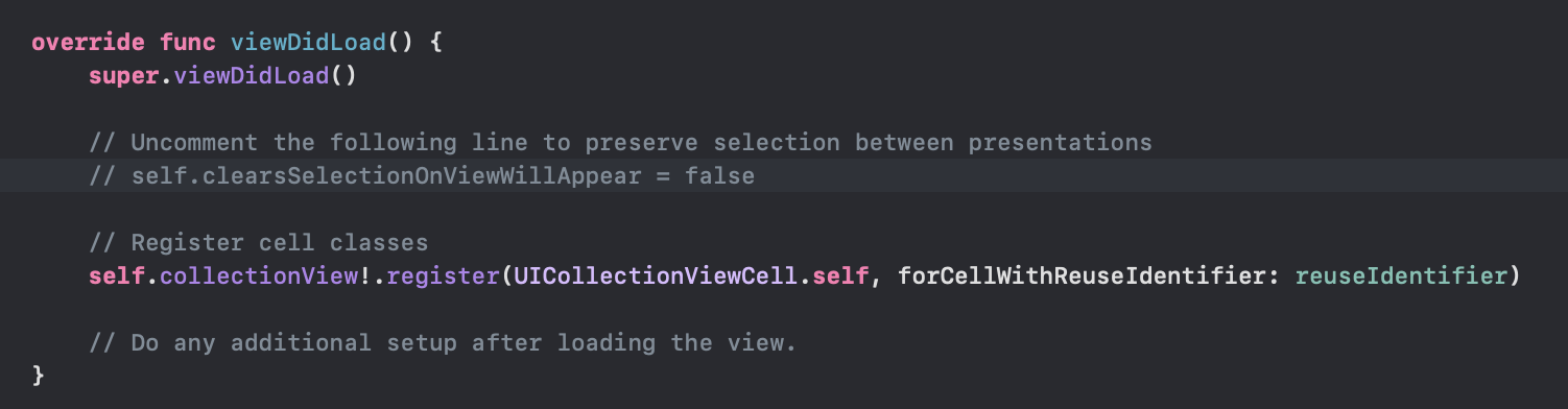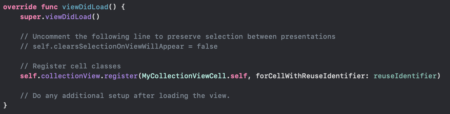 처음부터 self.collectionView!.register() 이란 메서드가 실행되고 있는데요 이 메서드는 컬렉션 뷰에 사용할 셀을 추가하는 메서드입니다. 매개변수로는 어떠한 셀을 추가할 것인지 그 셀을 구분하는 이름인데 저희는 아까 셀을 직접 만들었기 때문에 UICollectionViewCell 대신 저희가 만든 셀로 바꿔보겠습니다.