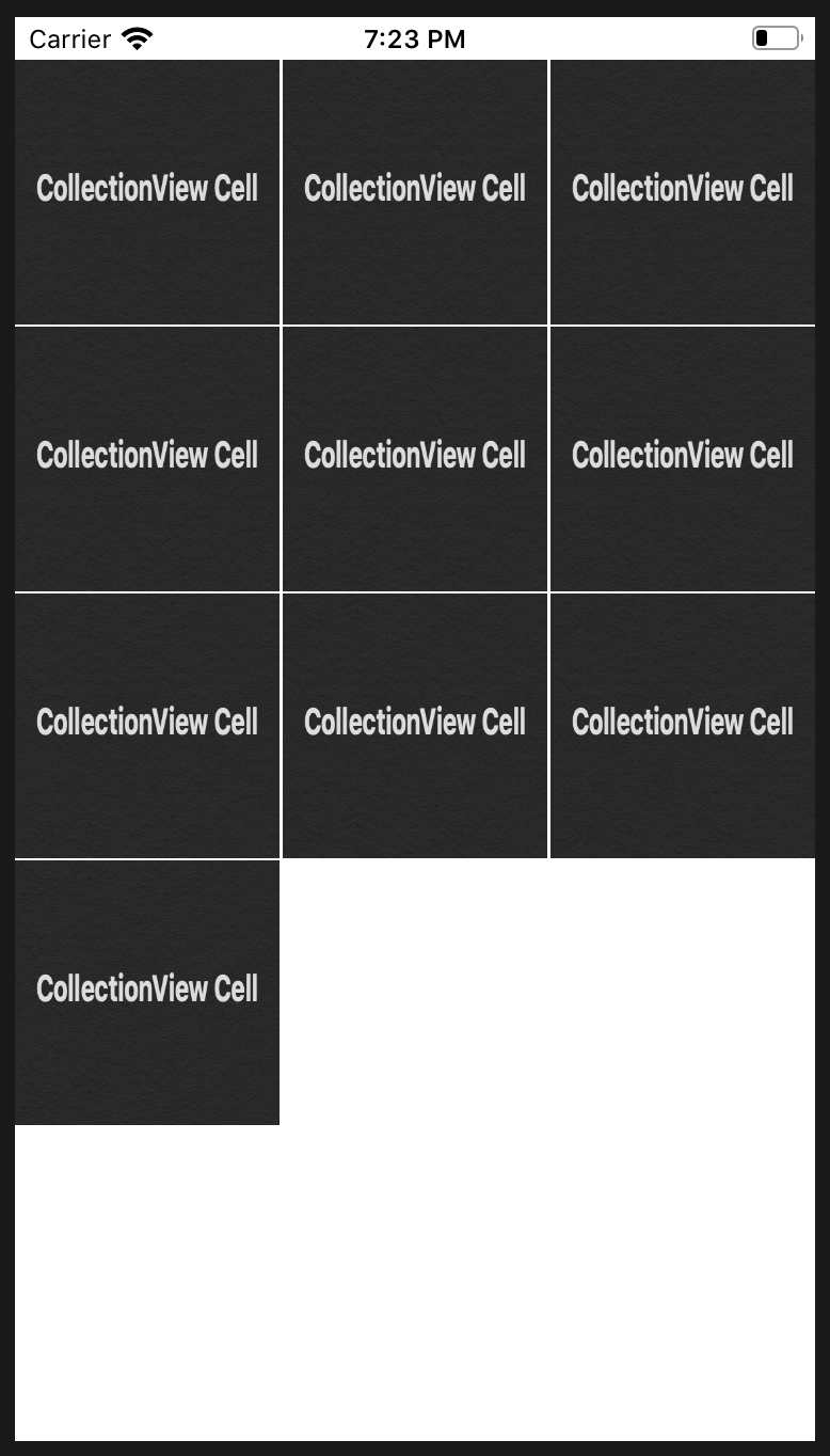 한 줄에 3개씩 보이게 하려면 화면의 가로길이를 3등분 한 크기만큼 셀의 크기를 조정해주면 됩니다. 하지만 저는 셀 간의 최소거리를 1로 지정해줬기 때문에 3 등분한 것보다 1만큼 더 작은 값으로 셀의 크기를 조정해줬습니다. 그리고 배경색도 흰색으로 바꿔보았습니다. 이렇게 구현한 함수를 viewDidLoad()에서 호출해주면 됩니다. 그렇게 하면 처음 봤던 화면이 나타나게 됩니다.