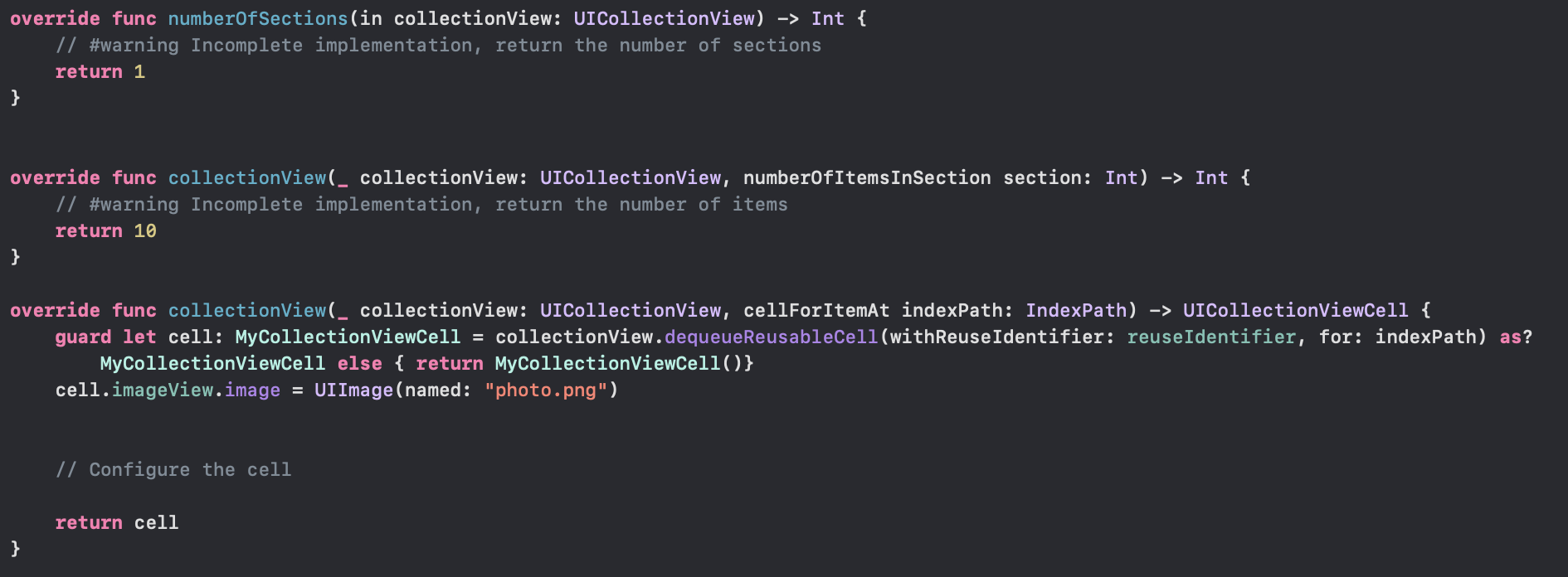 collectionView(_ collectionView: numberOfItemsInSection section) -> Int 메서드는 매개변수의 이름에서 기능을 알 수 있는데 섹션당 항목 수를 반환하는 메서드입니다.