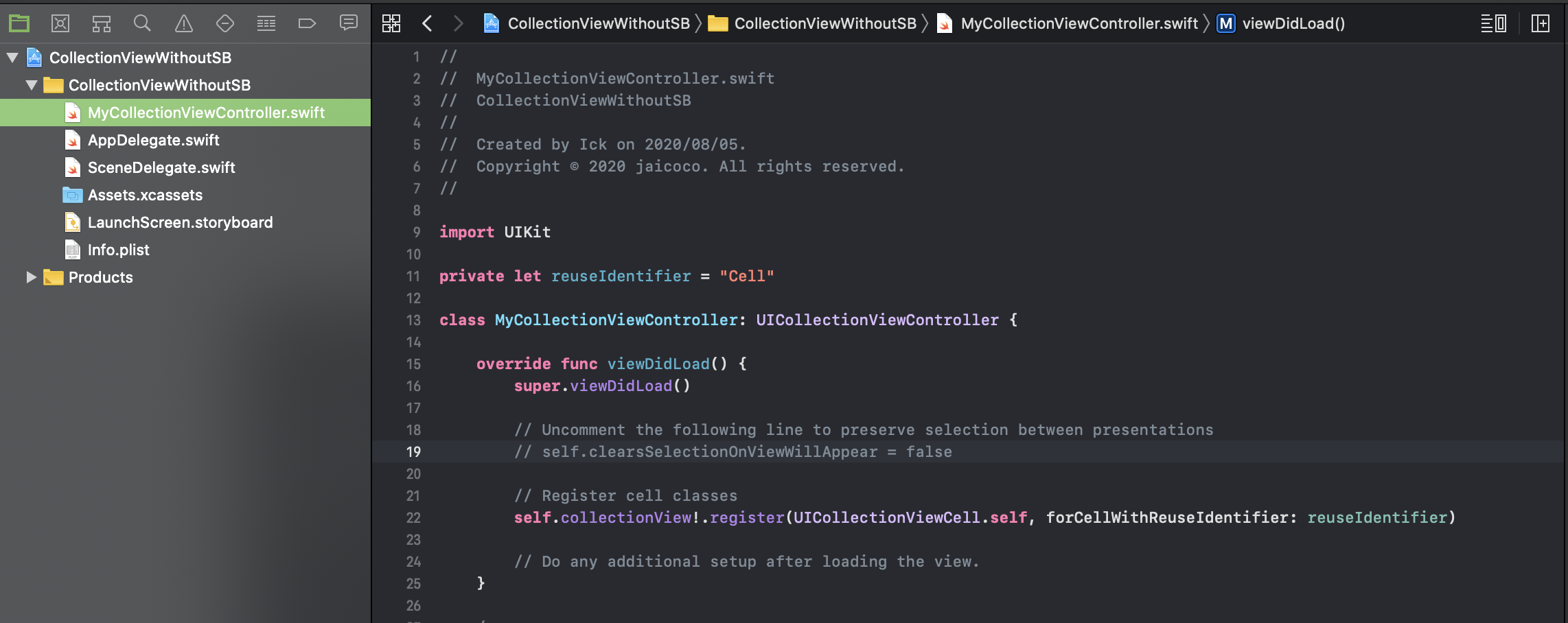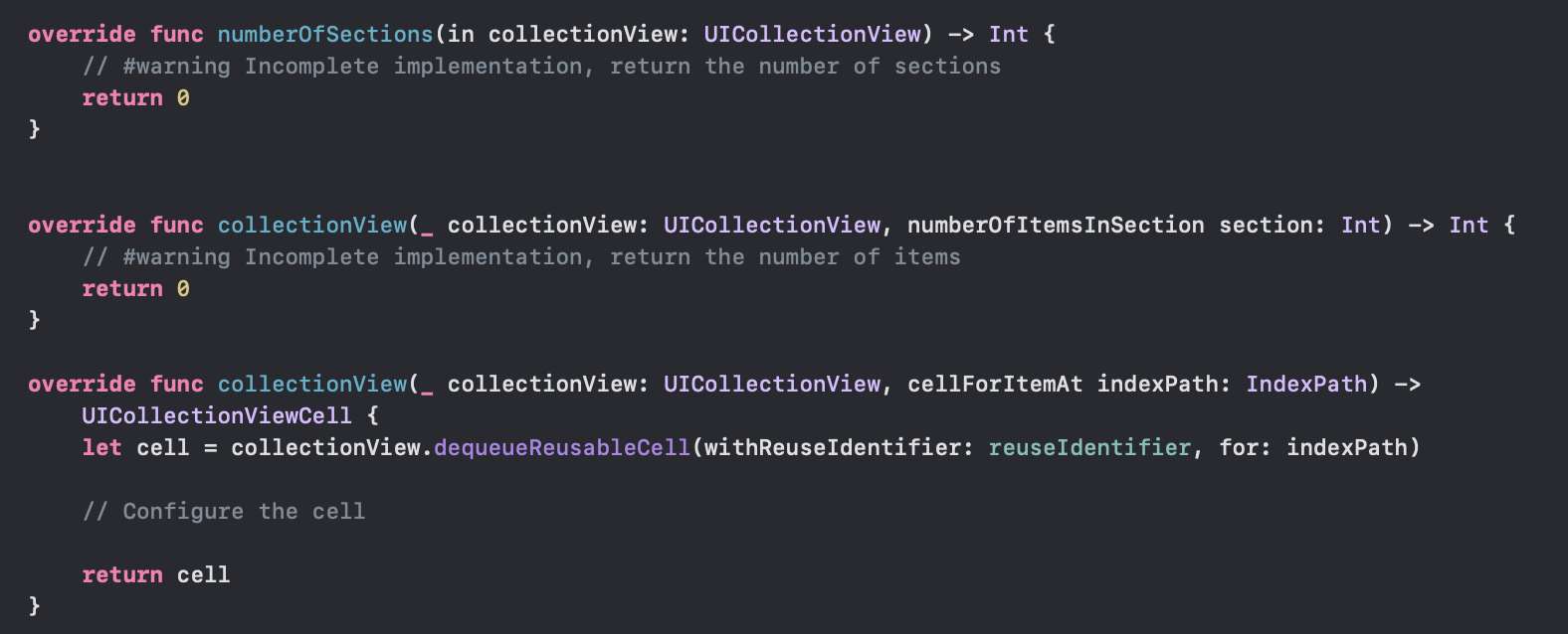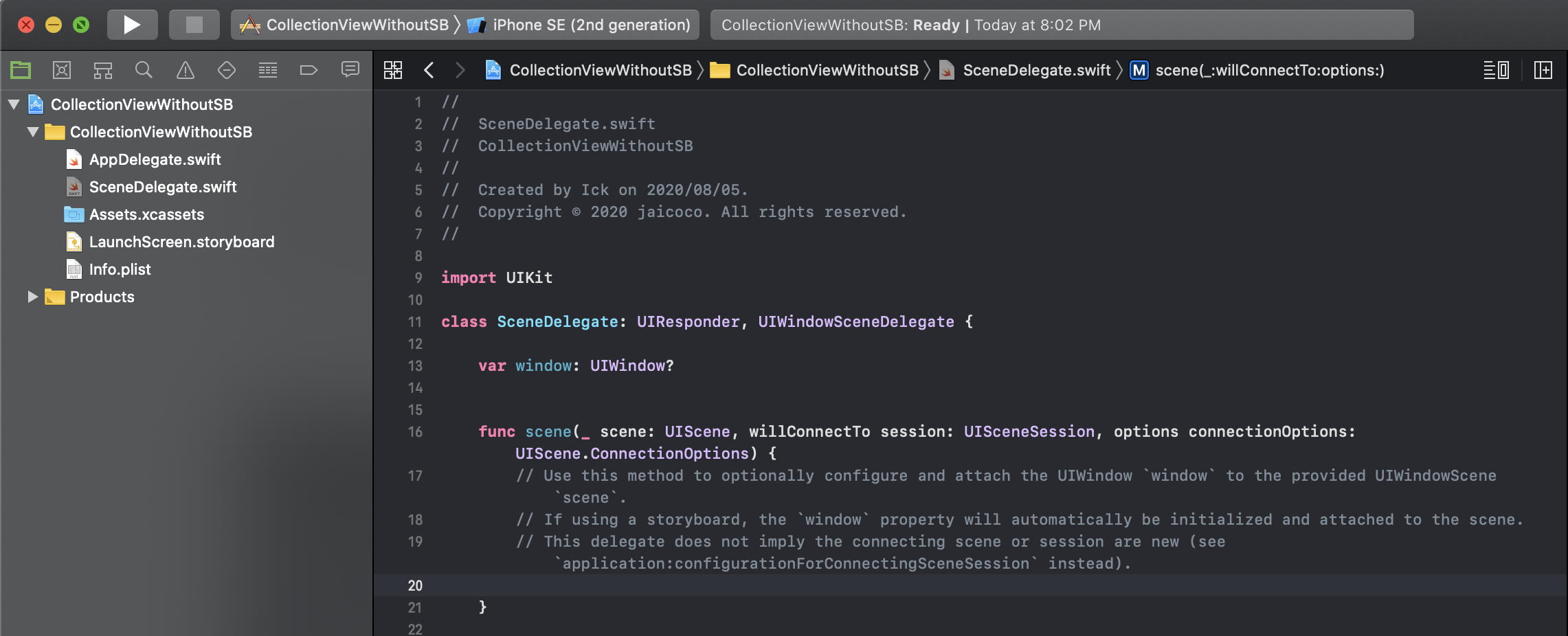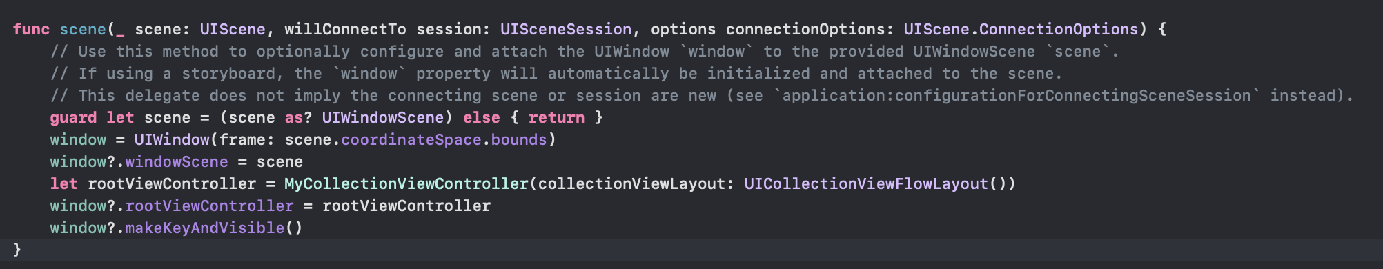 이번에 구현할 뷰는 컬렉션 뷰 이므로 컬렉션 뷰 컨트롤러로 추가해줍니다. 추가를 해주면 위와 같은 화면일 텐데요 이미 컬렉션 뷰를 구현하는데 필요한 것들이 많이 구현되어있습니다. 그전에 우선 SceneDelegate.swift로 가서 아래와 같은 코드를 추가해줍니다.