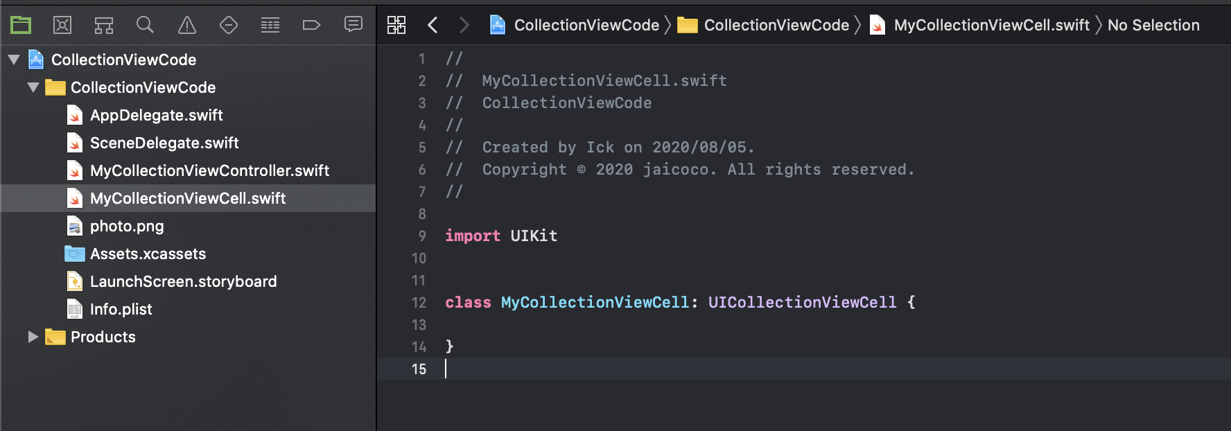 이번엔 컬렉션 뷰에서 사용할 셀을 구현할 코드를 만들어 보겠습니다. UICollectionViewCell Protocol을 채택한 클래스를 구현해주면 되는데, MyCollectionViewCell이라는 이름으로 새로운 파일을 만들어 구현해보겠습니다. 아까와 같이 command + N 단축키를 사용하여 cocoa touch class로 만들면 됩니다.