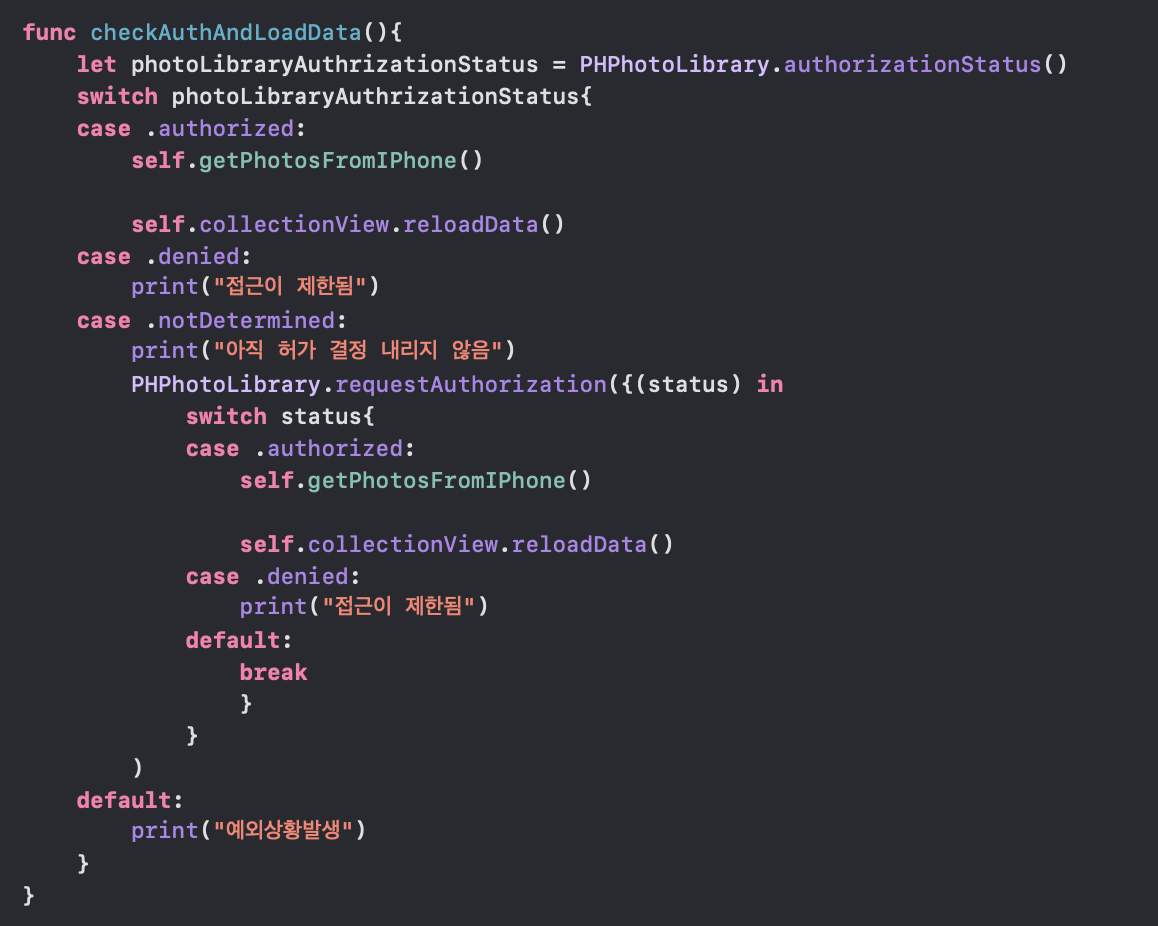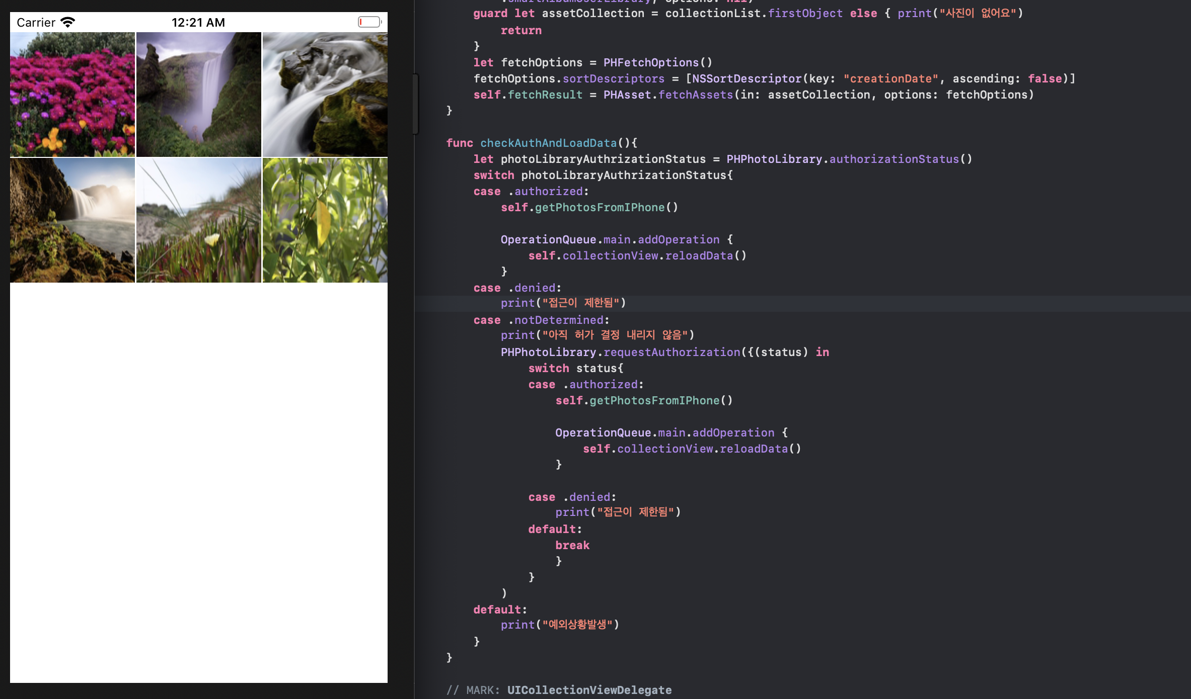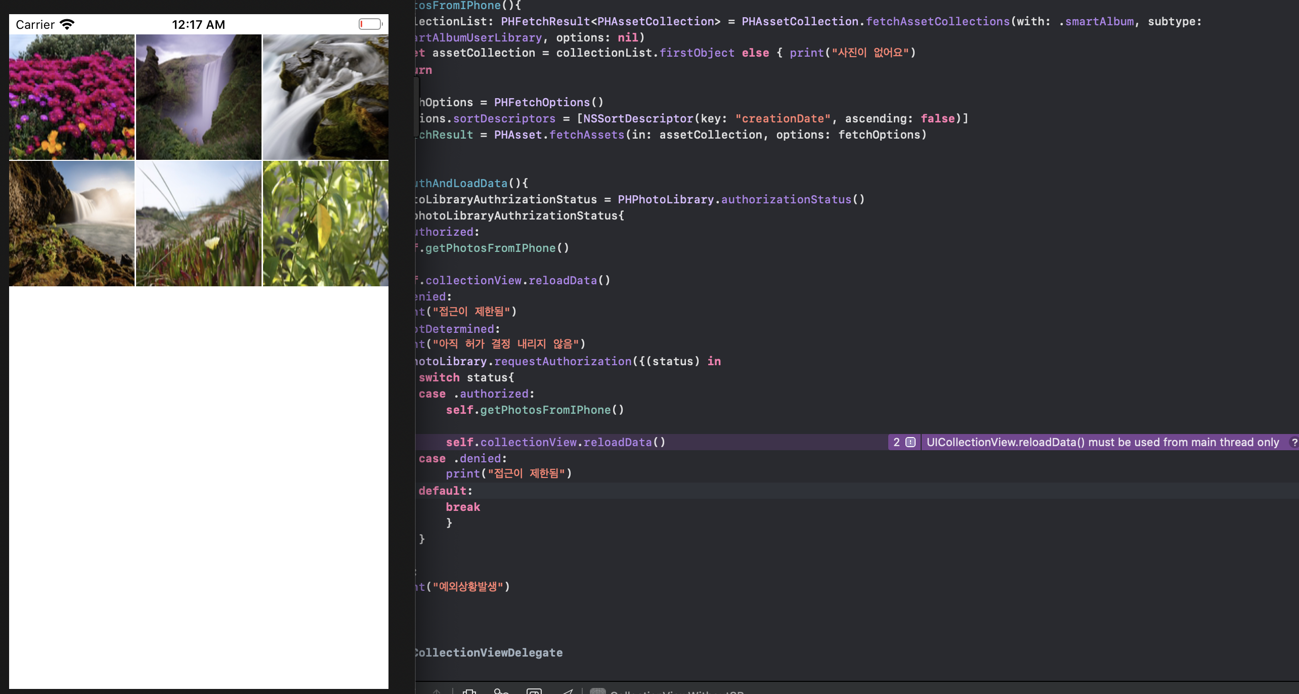 ??? 왜 아무것도 없을까요?? 이는 아까 전의 허가가 잘 됐는지 확인하는 화면을 보면 이해를 할 수 있습니다. 앱 실행과 동시에 컬렉션 뷰의 셀들을 만들게 되는데 이 때는 사진첩 접근을 허가하기 전이기 때문에 fetchResult엔 0개의 사진이 있습니다. 따라서 생성되는 셀도 0이라서 아무것도 만들어지지 않는 것입니다. 허가를 한 뒤엔 fetchResult에는 사진이 있지만 앱에서 새로고침을 해주는 기능을 만들지 않았기 때문에 아무런 변화 없이 그대로 있는 것입니다. 이러한 새로고침은 reloadData() 메서드로 해결할 수 있습니다.