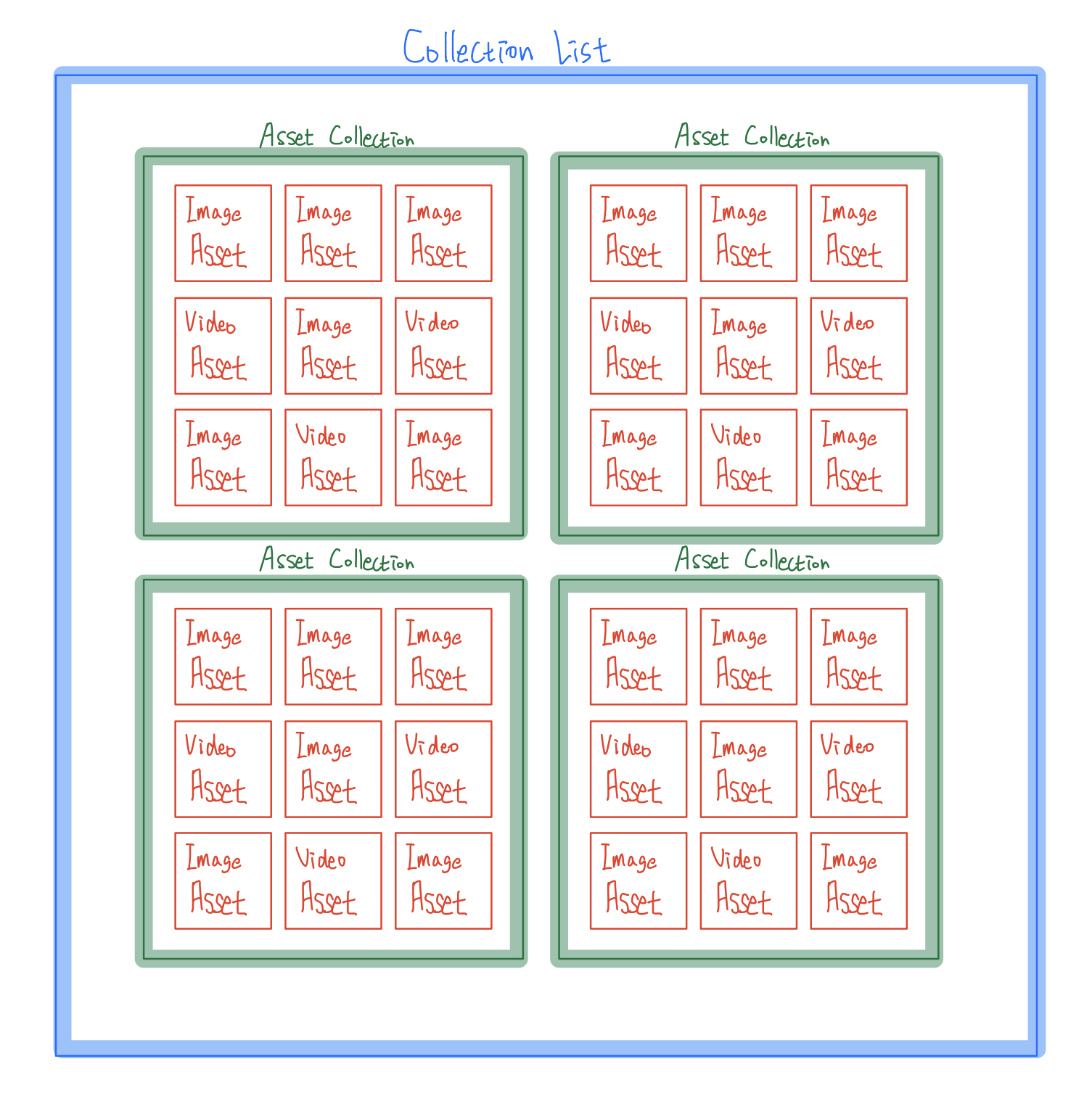 위의 그림과 같이 iOS의 사진과 비디오는 3 계층으로 되어있는데 간단하게 말하면 Asset과 Asset을 모은 Asset Collection, Asset Collection을 모은 Collection List로 구성됩니다. Asset은 사진이나 비디오 파일을 말하며 Asset Collection은 앨범이나 사진 폴더라고 보면 쉽습니다. 그리고 이러한 폴더들을 모아둔 것이 Collection List라고 볼 수 있습니다. 이러한 계층을 알아야 Photos 프레임워크의 사용법을 이해하기 쉽습니다.