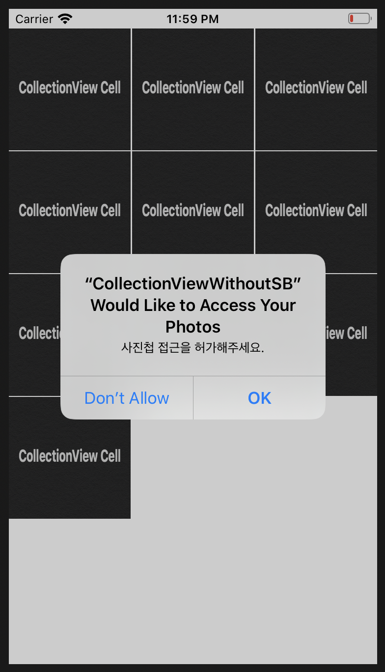 우선 원래 구현해 두었던 두 메서드를 수정해줘야 합니다. 이젠 아이폰의 사진 수만큼 셀을 만들 것이니까 섹션 당 항목 수를 수정해줍니다. 아이폰에 사진이 없을 경우를 고려해야 하기 때문에 저렇게 코드를 작성하면 됩니다. 그다음 해당 Asset을 가지고 와서 이미지 매니저로 UIImage로 변환해줘서 imageView의 image를 수정해줍니다. 그런 뒤 실행하여 사진첩 접근을 허가해주면 다음과 같은 화면을 만날 수 있습니다.