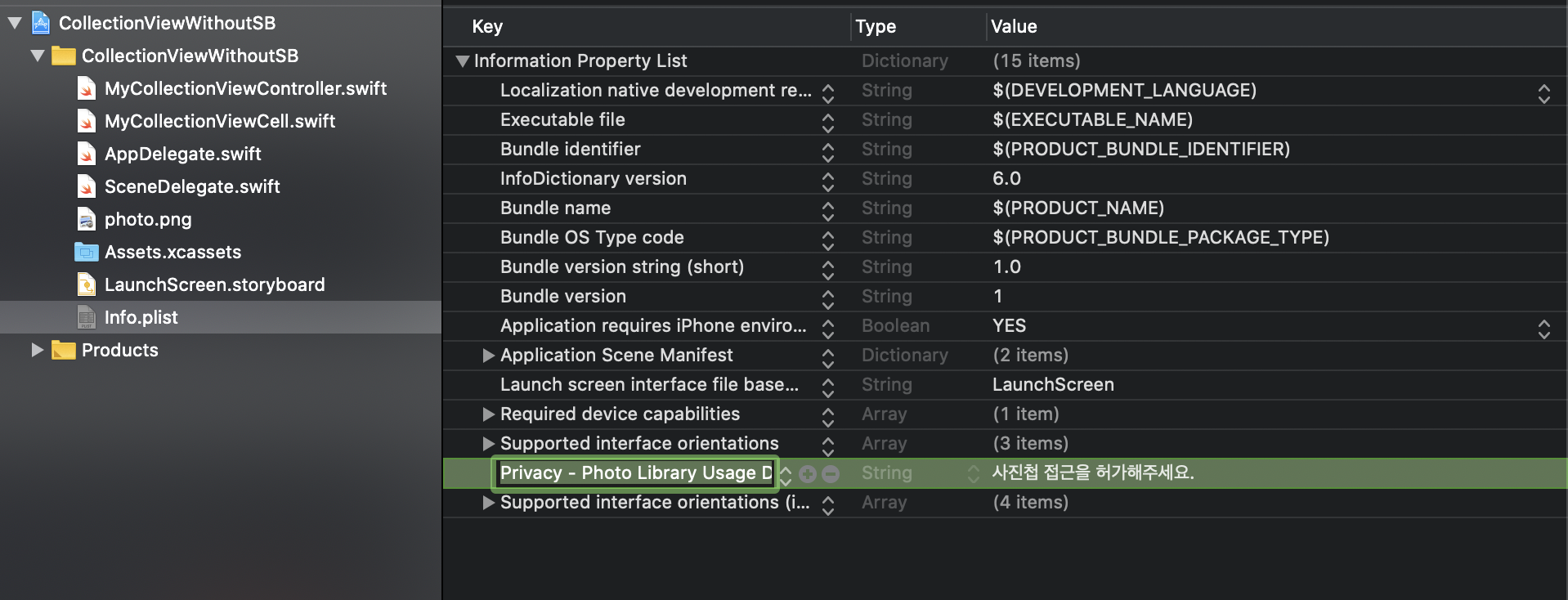 그런데 Apple에서는 이렇게 쉽게 사용자의 사진을 가지고 올 수 없습니다. 누구나 다른 사람의 사진첩에 접근할 수 있다면 보안의 위험이 있기 때문에 사용자에게 허가를 받아야 사진을 가지고 올 수 있습니다. 이러한 허가를 받기 위해서는 다음과 같은 작업을 해줘야 합니다.